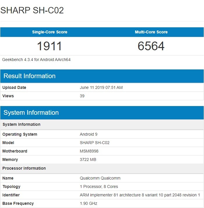 但其实,早在6月份的时候,Geekbench数据库就已经给出了夏普SH-C02这款智能机的基准测试成绩和更多配置细节。