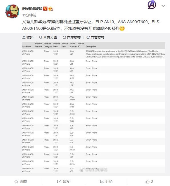今日晚间数码博主@数码闲聊站爆料称ELP-AN10、ANA-AN00/TN00、ELS-AN00/TN00是5G版本;此外并没有这些手机的更多信息。